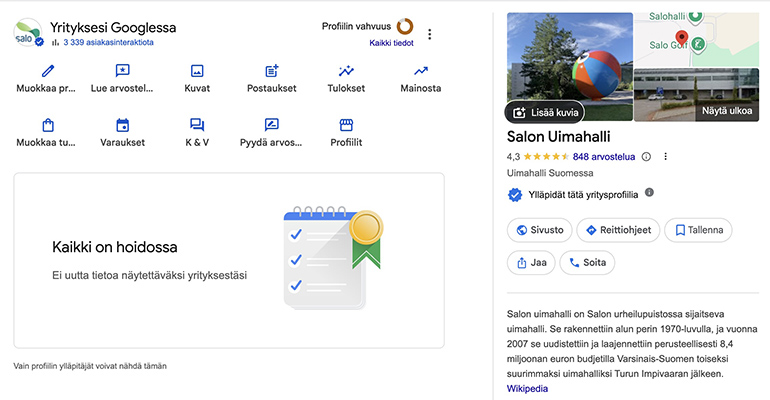 Olen jo useamman vuoden tehnyt keikkatyötä Salon liikuntapalveluilla. Eniten olen tuurannut uimahallilla. Aikoinaan saimme asiakkailta paljon palautetta siitä, että Googlessa on jatkuvasti väärää tietoa esimerkiksi hallin aukioloajoista. Päätin ottaa selvää, miten saisin korjattua sinne oikeat tiedot. Erilaisten vahvistusten jälkeen sain oikeuden uimahallin Googlen yritysprofiiliin eli siihen näkymään mikä tulee, kun paikkaa hakee Googlessa. Opettelin käyttämään yritysprofiilia. Hyödynsin myös Googlen omaa ohjepankkia. Sain päivitettyä oikeat aukioloajat. Vähitellen rupesin käyttämään myös muita toimintoja, kuten päivitysten ja tuotteiden lisäämistä. Lisäsin profiiliin myös kuvia. Samalla tavalla otin haltuun myös Lehmijärven uimarannan yritysprofiilin, koska sielläkin oli kesästä toiseen väärää tietoa.