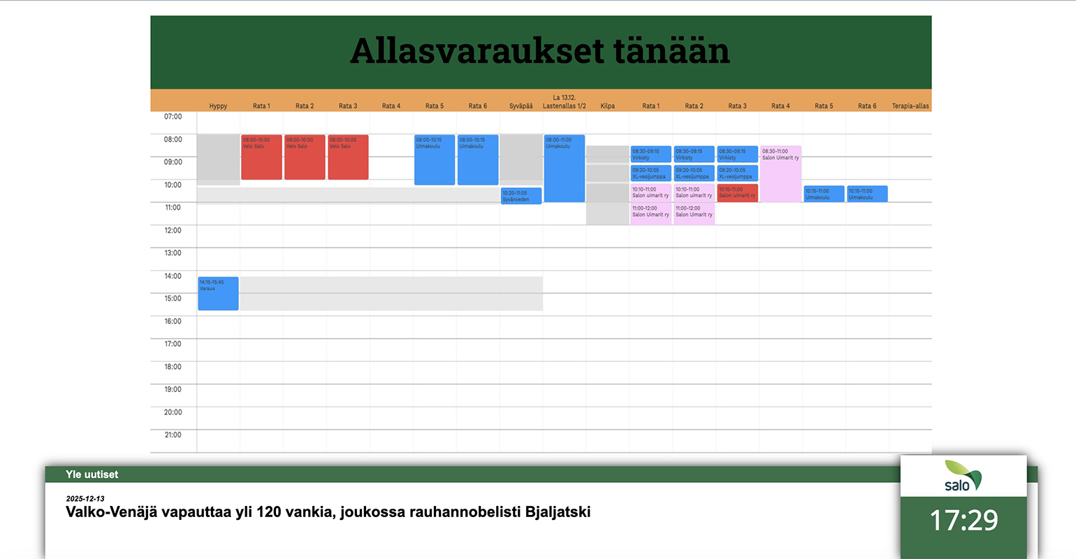 Vastuullani on ollut jo reilun vuoden verran myös uimahallin toinen infonäyttö. Idea lähti siitä, kun asiakkaat usein kyselevät allasvarauksia. Kysyin esihenkilöltäni luvan päivittää allasvarauksia infonäyttöön. Liikuntapalveluiden tiedotussihteeri antoi minulle pikakoulutuksen ohjelmiston käyttämiseen, jonka jälkeen olen viikoittain päivittänyt allasvaraukset sekä muita tärkeitä tiedotettavia asioita näytölle. Ohjelmistontarjoajalla on myös oma oppimisympäristö, jossa on paljon ohjevideoita järjestelmän käyttämiseen. Näitä olen myös hyödyntänyt.