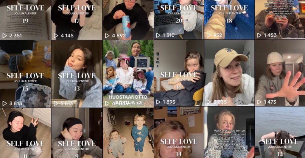 Julkaisimme joulukalenterin luukut vuoropäivin. Jokainen video käsitteli pientä, helposti toteutettavaa self-love-tekoa, jonka avulla katsoja pystyi pysähtymään hetkeksi oman hyvinvointinsa äärelle.